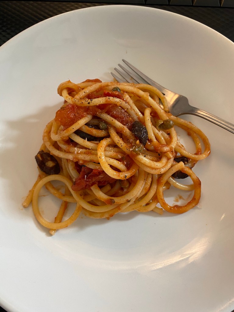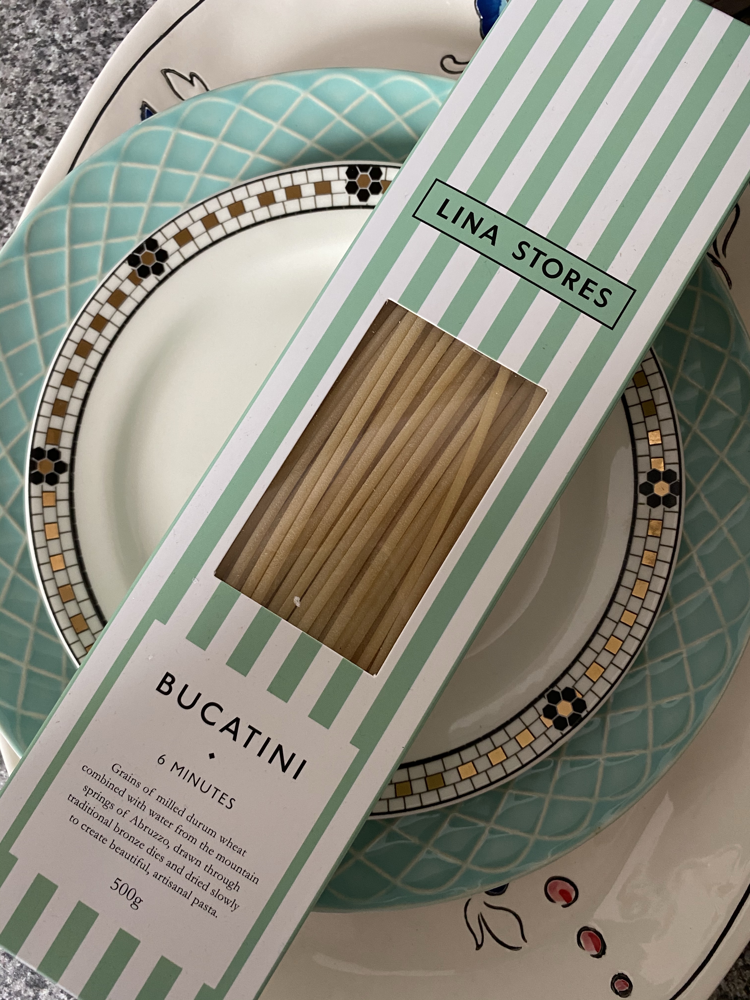 I opened a pack of bucatini I bought from Lina Stores a few weeks ago (I love an unusual pasta). If you don’t know what bucatini is, it’s a thick spaghetti with a hole through the centre.