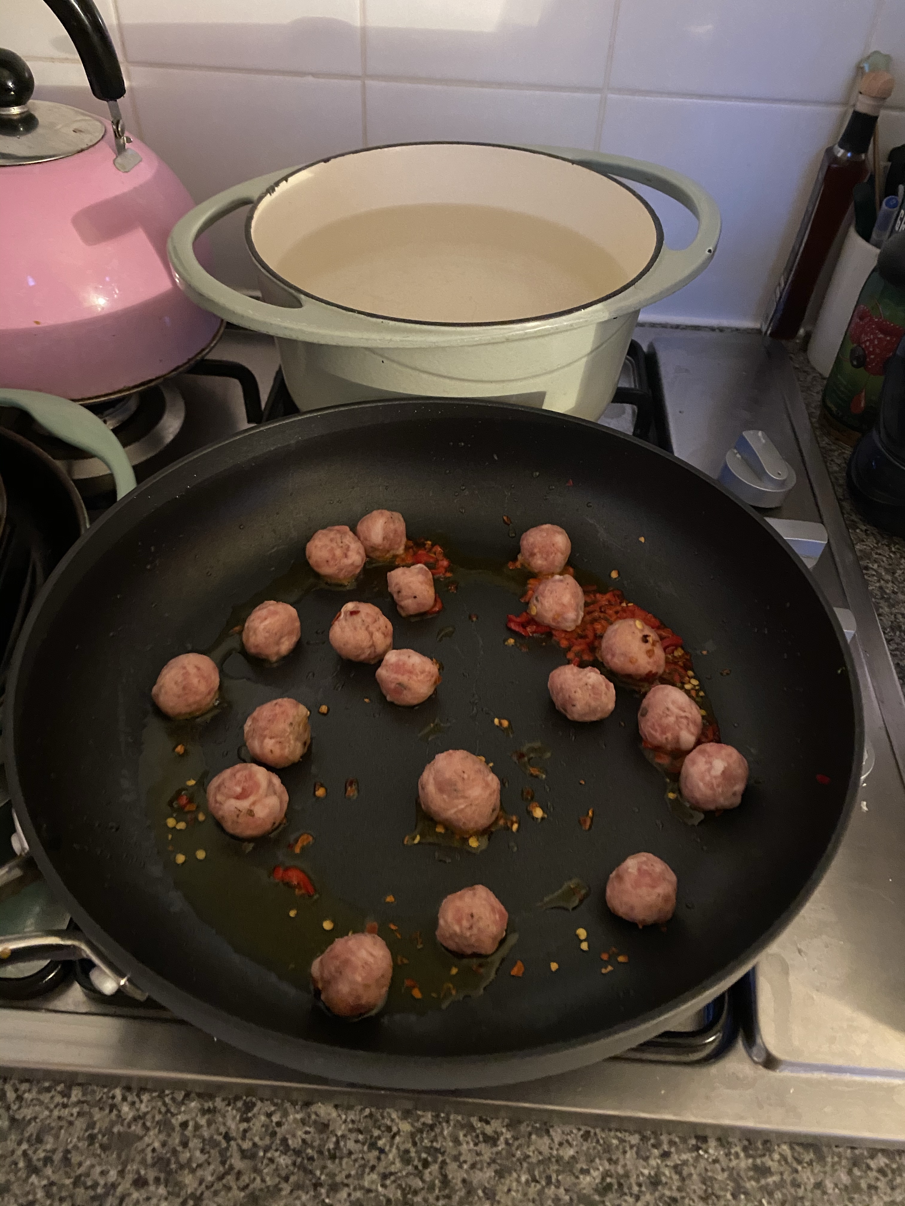 Pop your water on to boil for the pasta. In a separate pan, heat some oil and add some dried or a chopped fresh chilli (or in my case, both). I also add some fennel seeds (which I forgot until half way through this evening… told you I was tired!) Take two sausages per person and squeeze out the contents into little blobs (slightly bigger than a marble). These will be your little meatballs. It feels weird and slightly gross at first, but don’t think about it too much and it’ll soon be done. I tend to go with two sausages per person.
