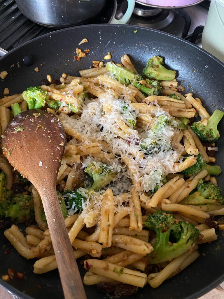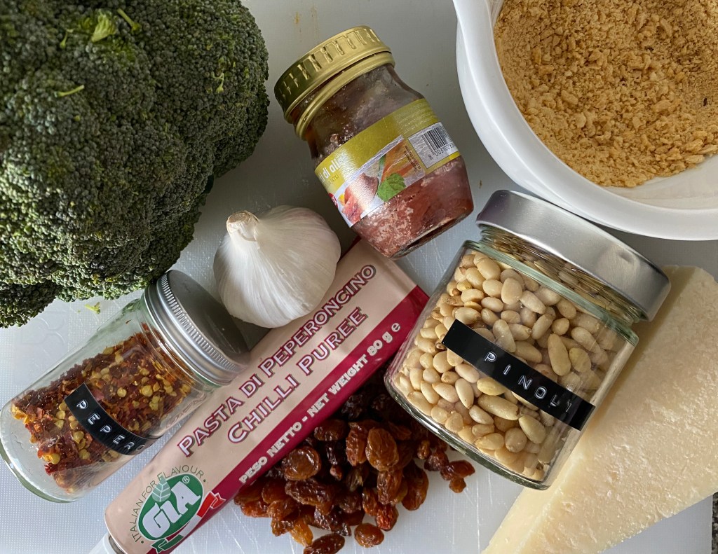 When you look at the ingredients, certainly many British people might scratch their head and wonder what it will taste like – it’s an unusual mix of ingredients – brocolli, chilli, garlic, breadcrumbs, anchovies, pine nuts, sultanas and pecorino cheese – basically all of Sicilian history in a bowl. But I am here to reassure you – it’s absolutely delicious and all works well, each part balancing with the others.