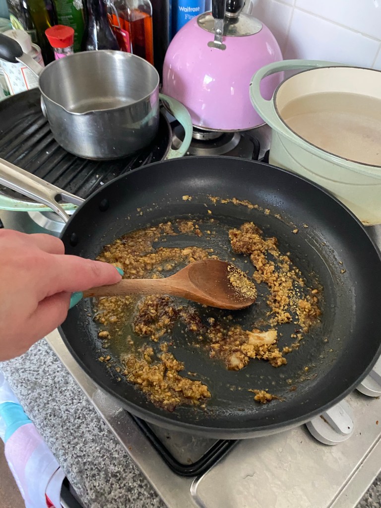 Water is put on to boil. You melt the anchovies in garlic oil and add toasted breadcrumbs. These should mingle into a super-savoury slightly thickened mixture which you put to one side. At this point you need to pop broccoli in the water until tender.