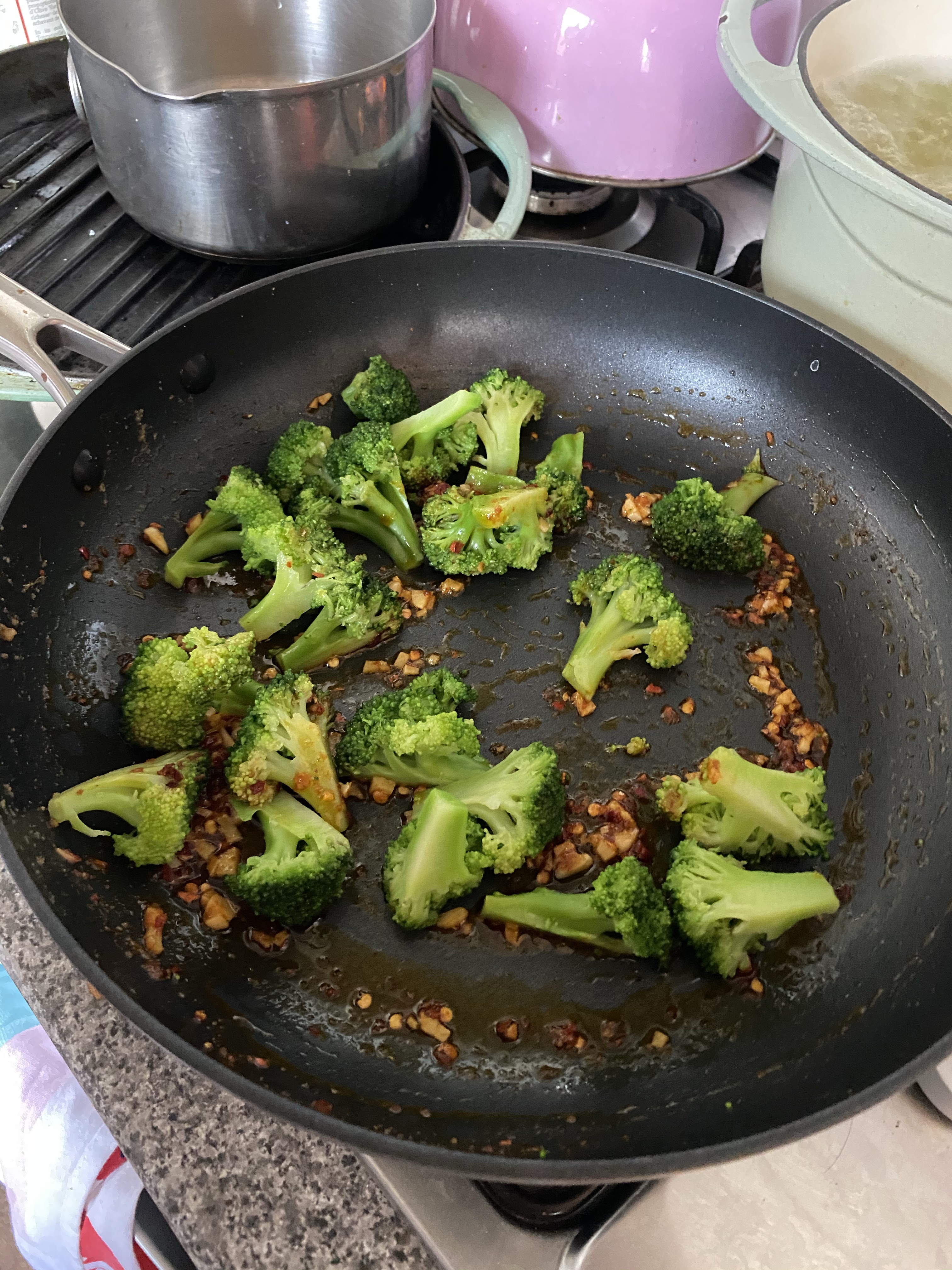 In a pan you add more olive oil, garlic and the chilli. Once the broccoli is tender you need to remove it from the water (which should stay on boiling for the pasta – which should be added now). Quickly run the broccoli under some cold water so it stays bright green and add it to the chilli pan.