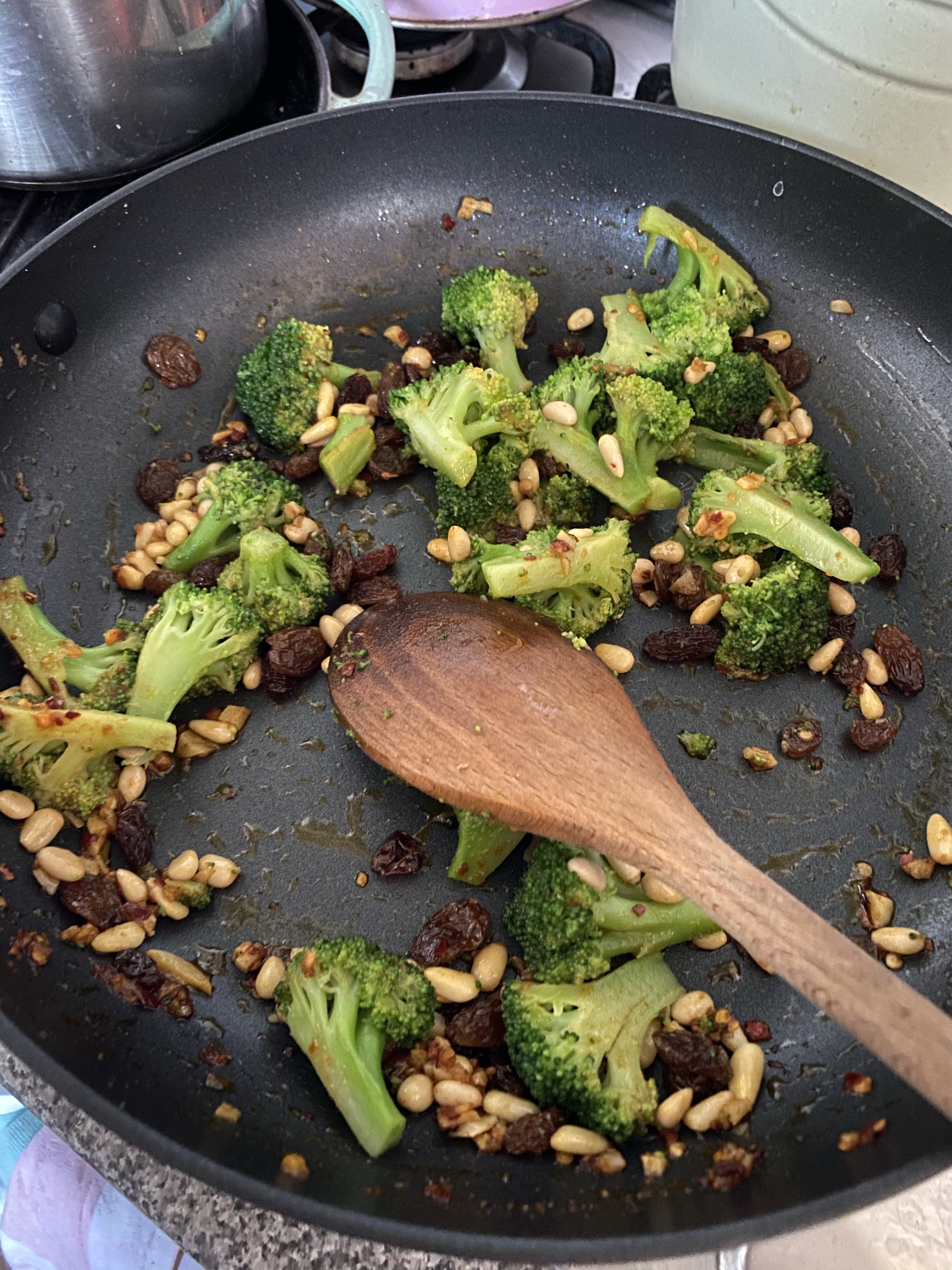 To the chilli-broccoli mix (which frankly I would eat as is, it looks beautiful and I really should do as a side dish more often!) you add pine nuts and sultanas. Keep it on a very low heat until the pasta is cooked.